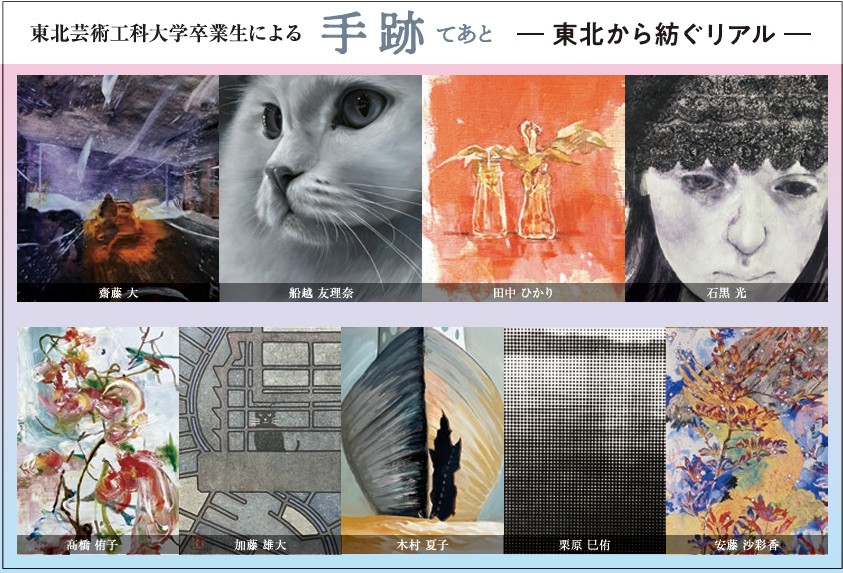 ━東北芸術工科大学卒業生による ━ 「手跡 ━東北から紡ぐリアル━」 2026.02.06 ━東北芸術工科大学卒業生による ━ 「手跡 ━東北から紡ぐリアル━」 2026年 2月18日(水)~24日(火) 会場 松坂屋上野店 7階アートギャラリー 出品作家 安藤沙彩香 石黒光 加藤雄大 木村夏子 栗原巳侑 齋藤大 髙橋侑子 田中ひかり 船越友理奈